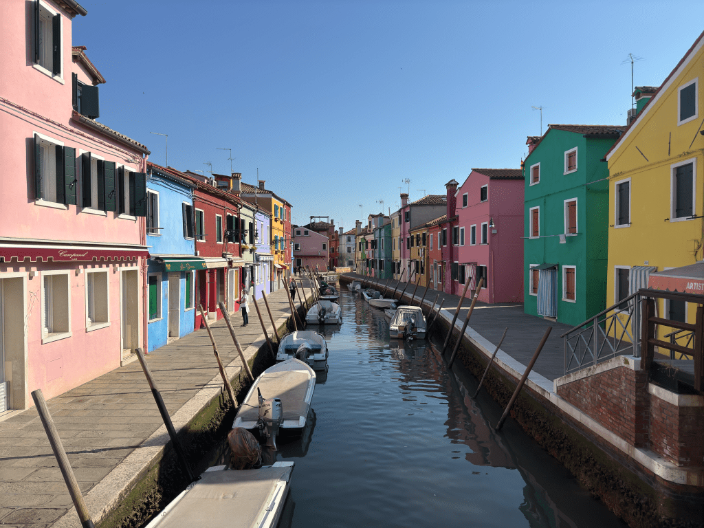 Woke up at 6:45 took the boat near the hotel at 7:40 am in 40 mins we arrived in Burano the city was amazing totally empty. We took few pictures around but the the camera stop working unfortunately so we went to a bar for breakfast Bar Cafe Palmisano trying to fix it and then enjoy a bit. After we grabbed a slice of pizza at Devil Pizza and then we took the ferry back to Venice at 12:55 pm.We went back to the hotel. The got an ice cream at Gelato di Natura at Campo Santi Apostoli. Then we went to visit Teatro La Fenice which there was trial of an opera going on actually and then we went for an aperitif at enoteca al volto – ombre cicheti to try other cicchetti and have an aperol spritz. And then we passed by ponte vecchio to take same picture and then we went for dinner at Ristorante da Raffaele at 7 pm as we booked which we had a really nice dinner and then after we walked back to the hotel to sleep.