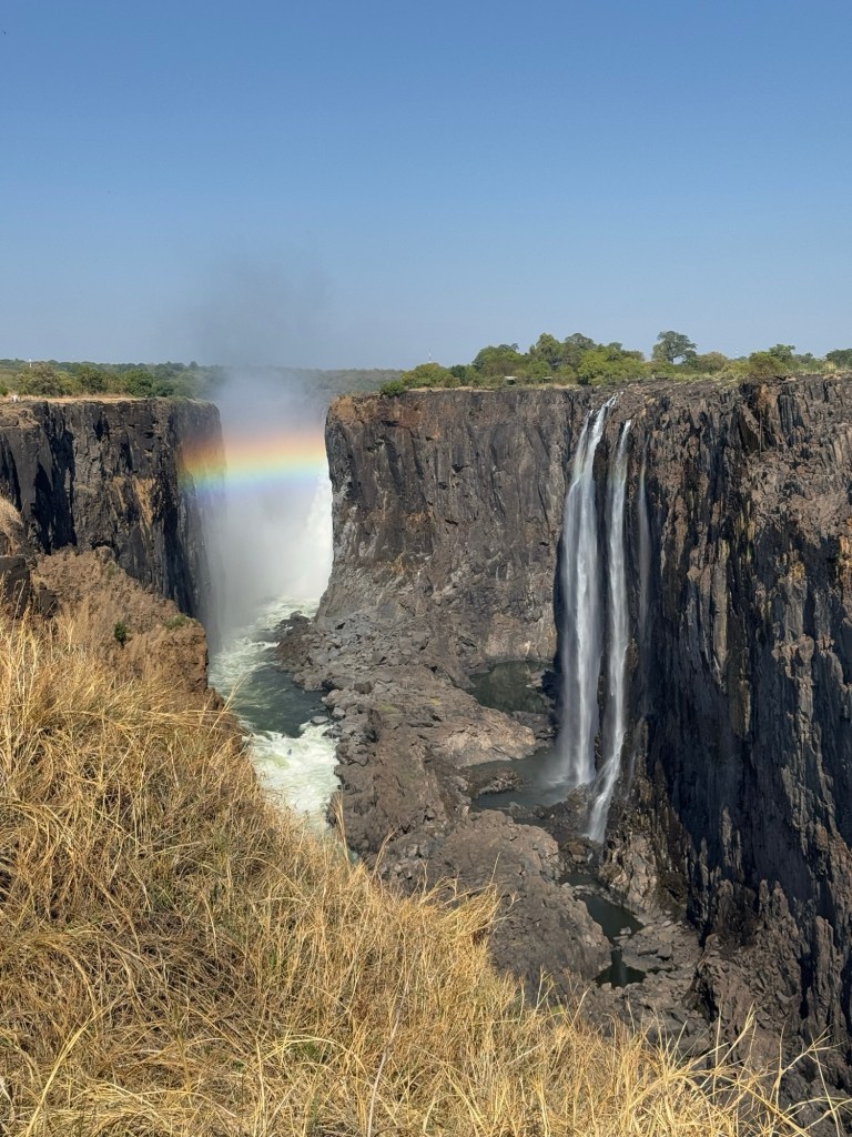 Woke up at 6:30 am at breakfast at the accommodation by the Zambezi river which it was very peaceful besides the monkey stealing the food. Then at 8 am we got picked up at the hotel to visit the falls in the Zambia side which it was absolutely amazing we were just me Carmel and our tour guide. Absolutely an amazing experience comparing to the other falls that I visited in the world. After with the driver we crossed the border to enter in Zimbabwe and fortunately we could pay by card and one we stamp the passport we meet our next driver and tour guide where he got our luggage and we walked with the guide to enter in the Zimbabwe side of the falls which it was a bit more crowded and unfortunately the weather was getting a bit more cloudy but still it was an amazing experience. Then the driver took us to the hotel where we checked in and we went for lunch with Rhino at the Three Monkeys which it was very good and then we chill and hang a bit at the hotel with the other and then we got ready for the sunset cruise where they pick us up in the hotel and went to the river to join the tour which it was fancier then expected with snakes and complementary drinks. It was an unique experience while we could enjoy and at the same time seeing crocodiles, hippos and buffalos. The only inconvenience was the weather that was a bit cloudy and rainy but overall was an amazing experience. Then we went back to the hotel had few drinks at the bar and then we went to sleep.