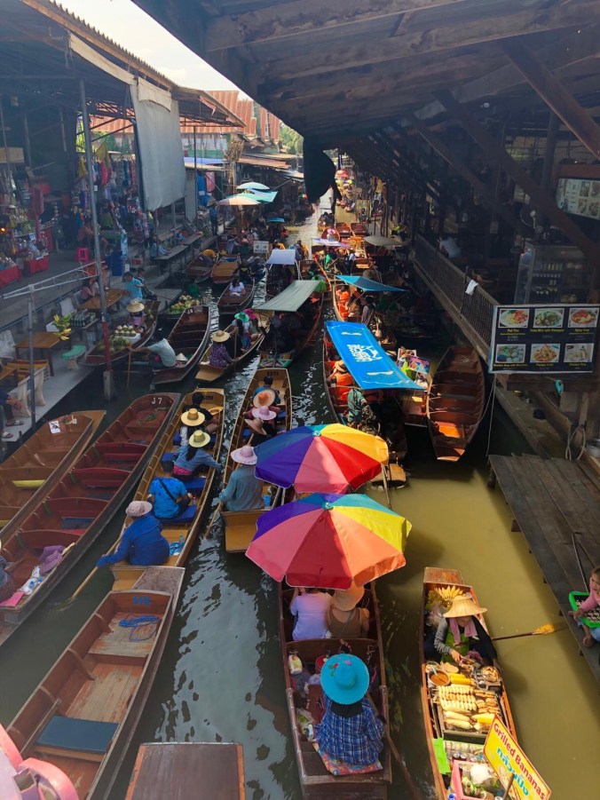 Our day started early with an alarm at 4:30 in the morning as we headed to the Floating Market. We caught bus number 78 from the southern bus stop, paying only 64 baht for a one-way ticket. Once we arrived, we took a one-hour tour by canoe. Since it was still too early, most of the market stalls were closed, so the canoe driver brought us back to the bus stop.