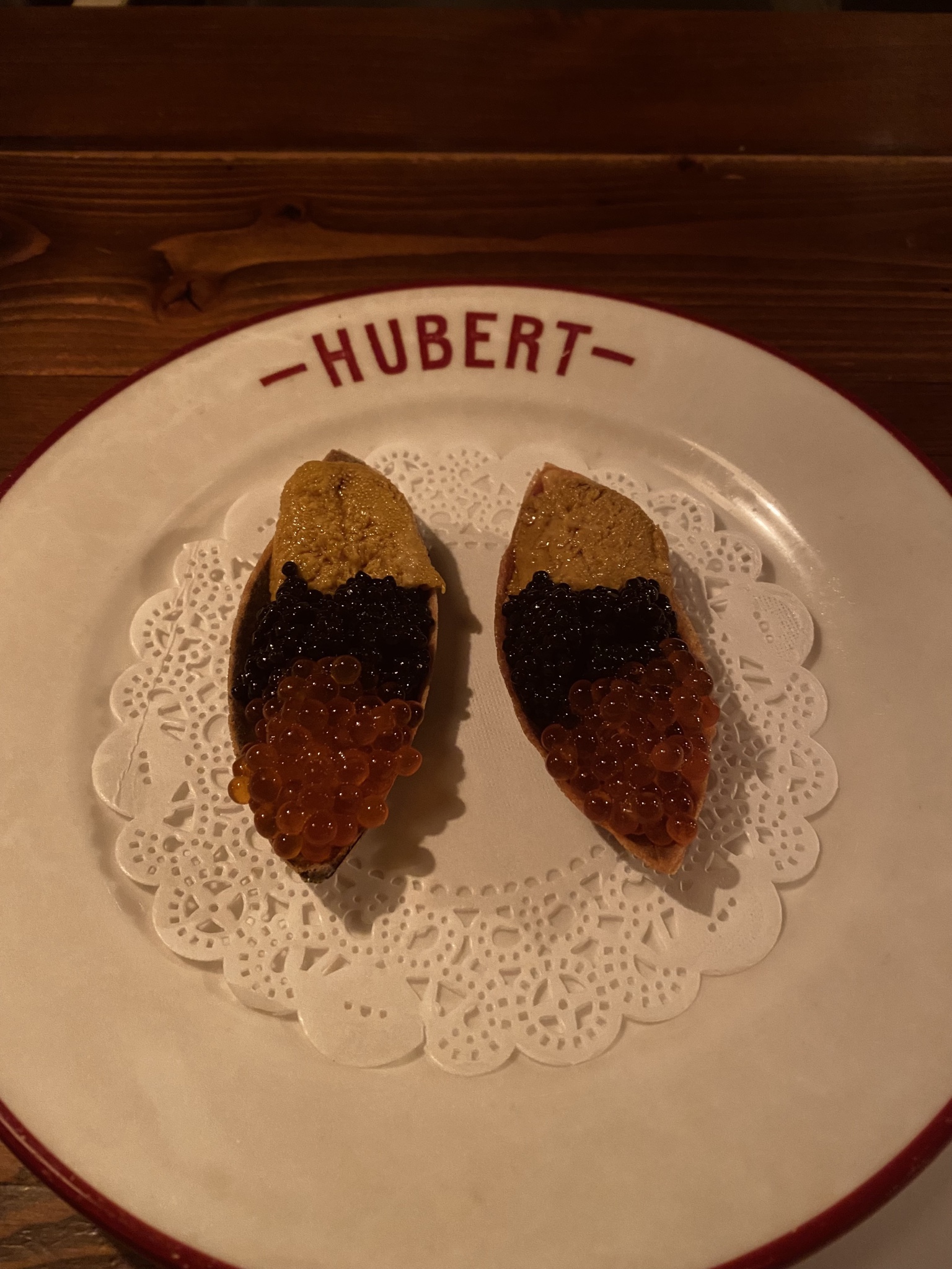 ( Sea urchin, trout roe and avruga tart. Dinner at Hubert restaurant in Sydney )